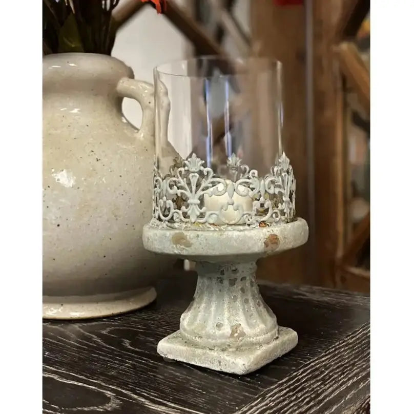 Cement Hurricane Base with Glass and Iron Fence. This candle holder is designed with distressed/rustic look.