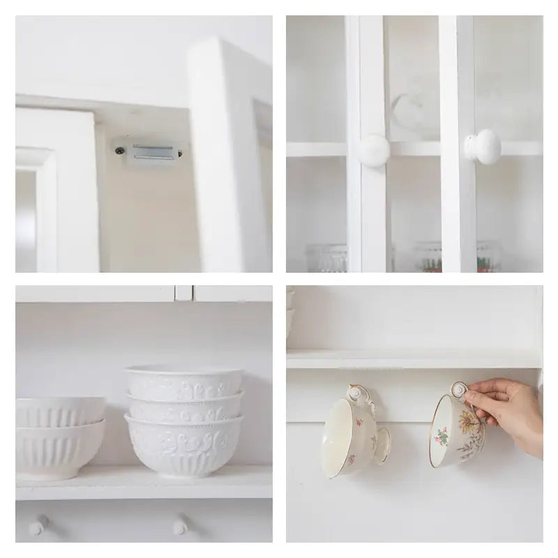White French-style distressed wall cabinet, versatile storage options, upper tier features transparent glass design for clear display, middle tier suitable for arranging bowls and plates, bottom hooks for hanging cups.