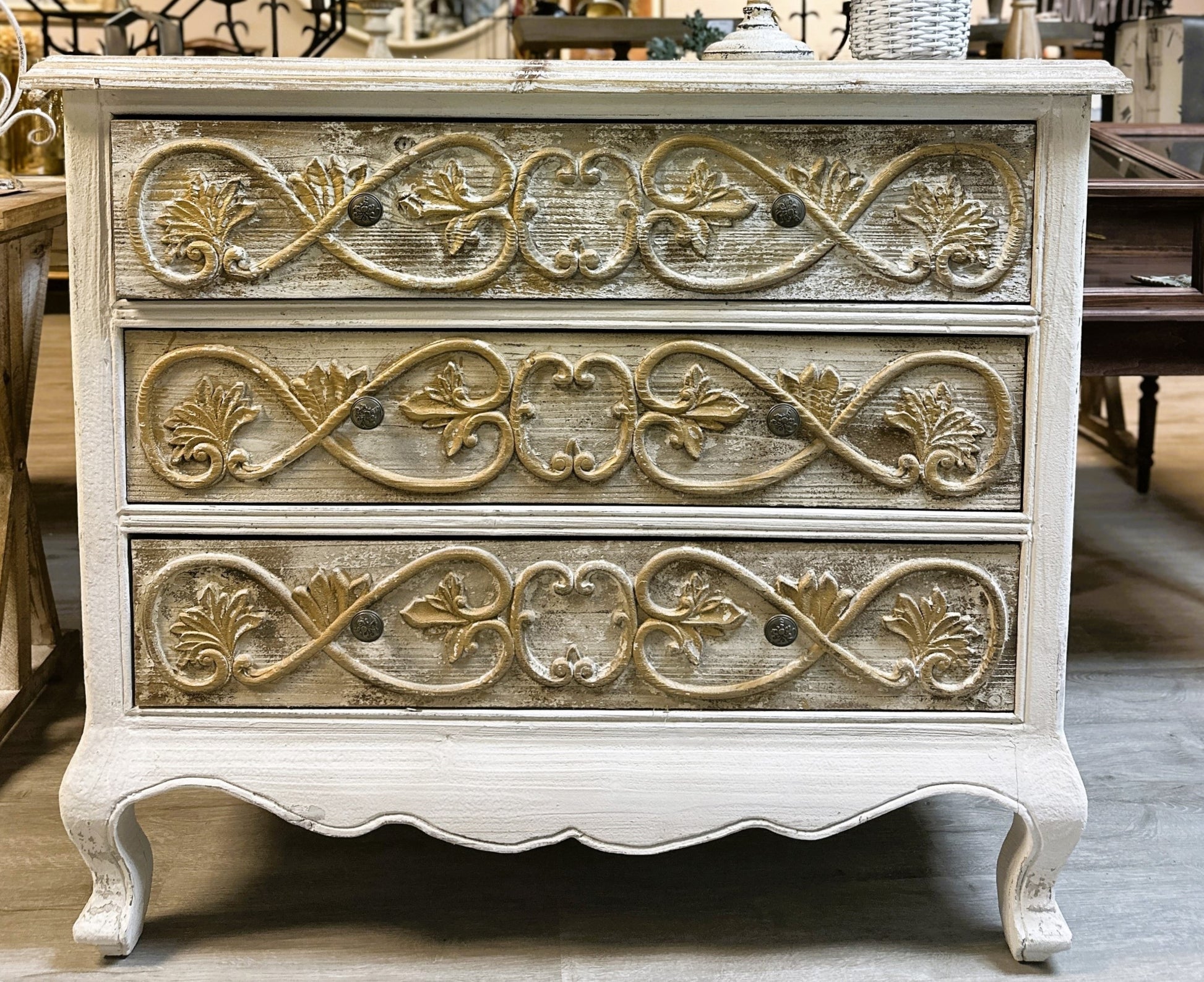 The drawer is handcrafted from solid wood and then finished in a distressed gold paint finish. Front features low relief carvings combining foliate and volutes on scrolling beads, a scalloped apron and cabriole legs. Solid brass pulls. Hand finished. Three drawers.
